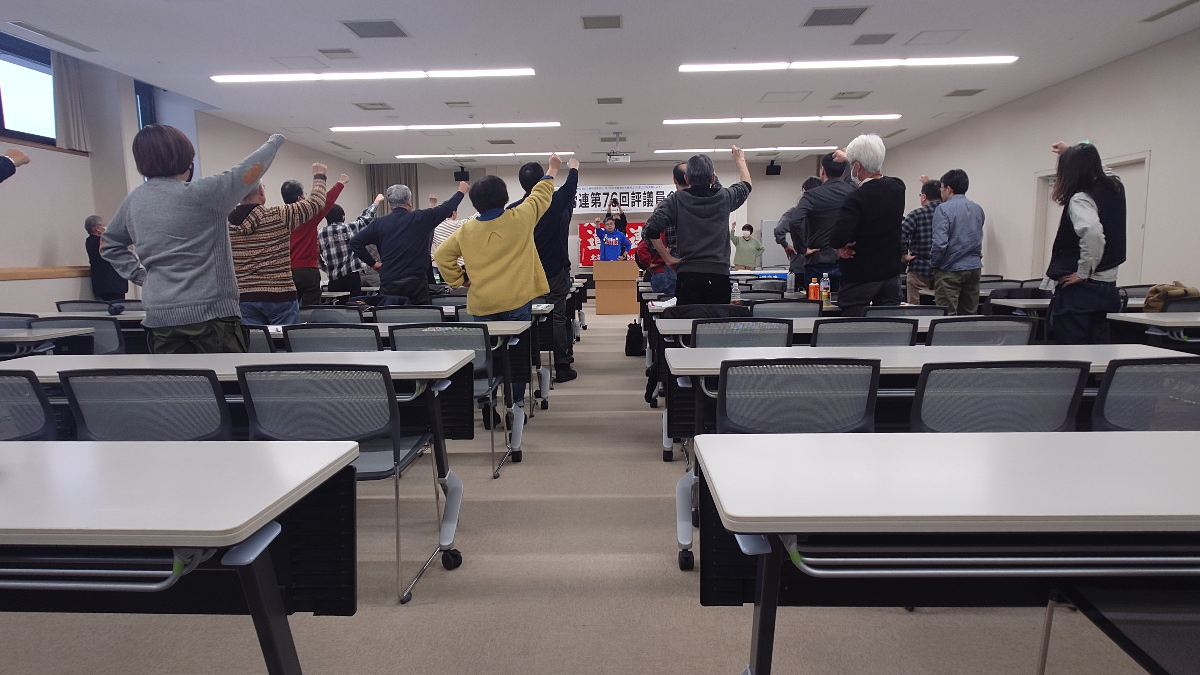 最後に全員で「団結してガンバロー」の掛け声とともにこぶしを掲げ無事評議員会は終了しました。各組織、春闘に向けて共に頑張りましょう!!