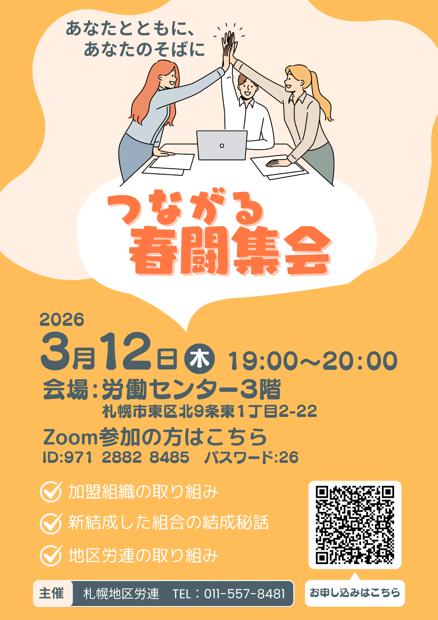 内容としては、札幌地区労連に加盟している組織の取り組みや近況報告、新しく結成した組織の結成秘話を聞いたり、地区労連としての取り組み報告などです。会場にいらっしゃる方にはちょっとした食べ物もご用意する予定なので、仕事終わりでお腹がすく時間かとは思いますが、加盟組織の皆様はぜひご参加ください。ZOOMで耳だけの参加も大歓迎です。ご参加の際は事前にお申し込みをお願いいたします。