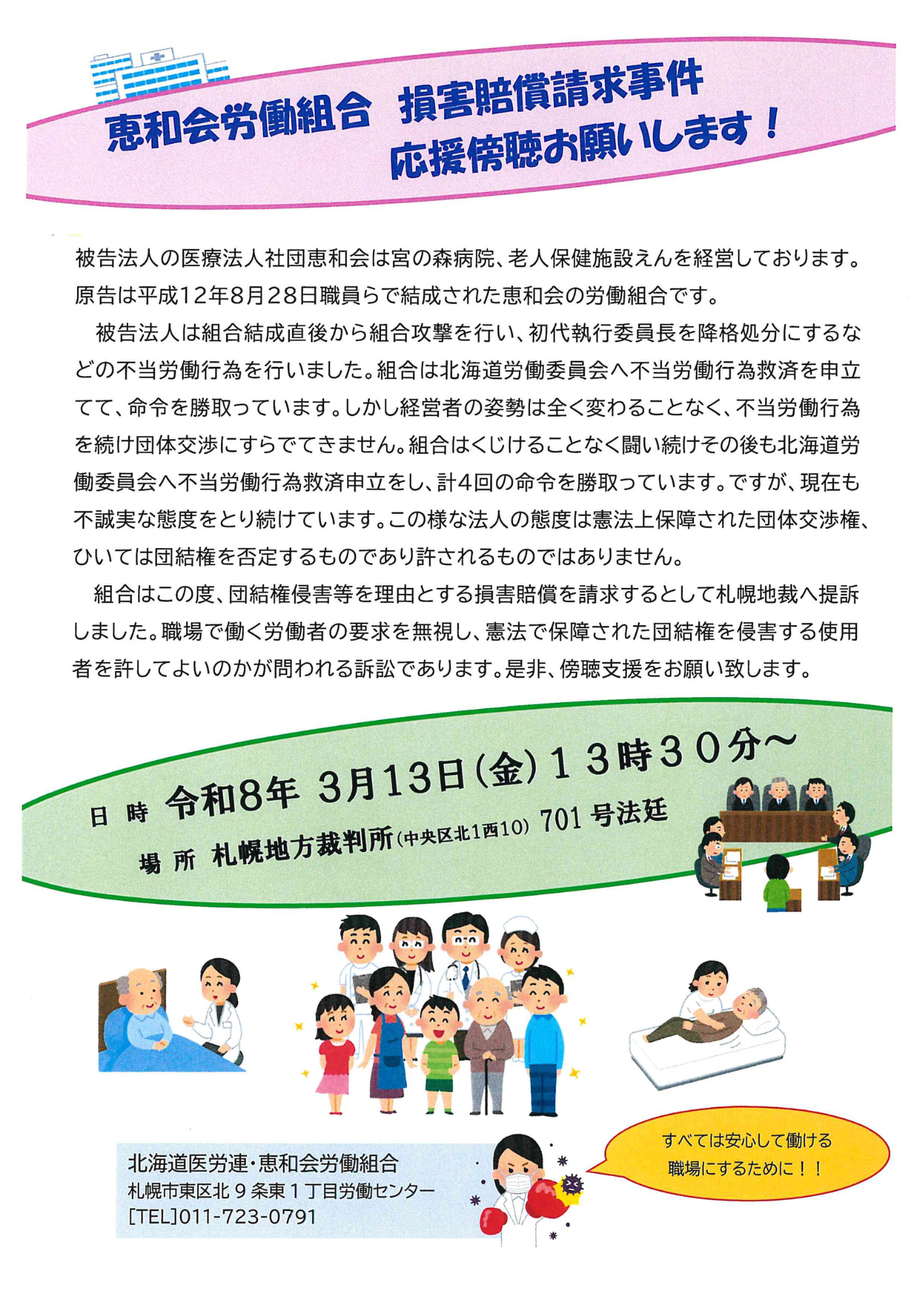 3月13日(金)の13時30分から札幌地方裁判所701号法廷にて、恵和会労働組合が損害賠償請求事件についての裁判を行うので、ぜひ傍聴支援をお願いいたします!